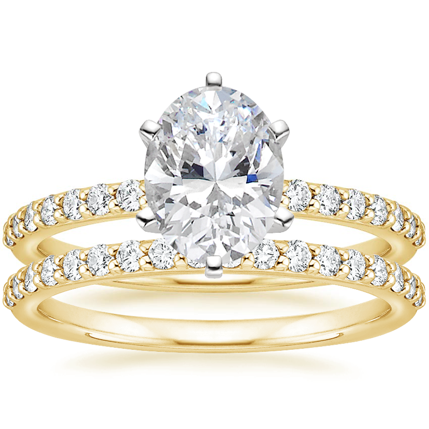 18K Yellow Gold Six Prong Petite Shared Prong Lab Diamond Bridal Set with 3.04 Carat Oval Lab Grown Diamond