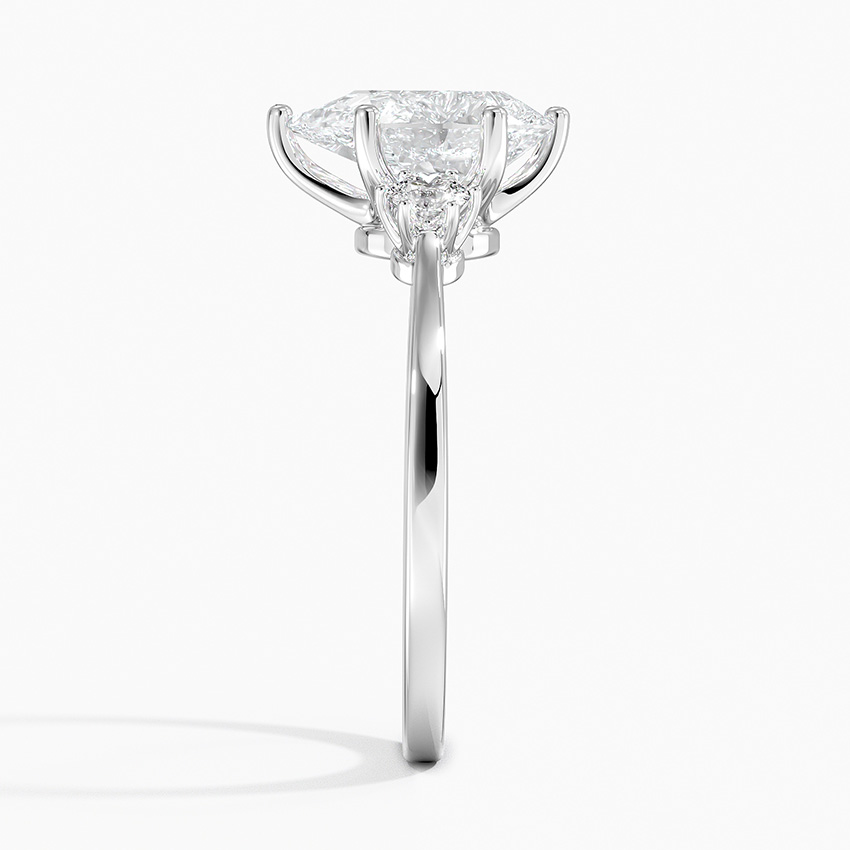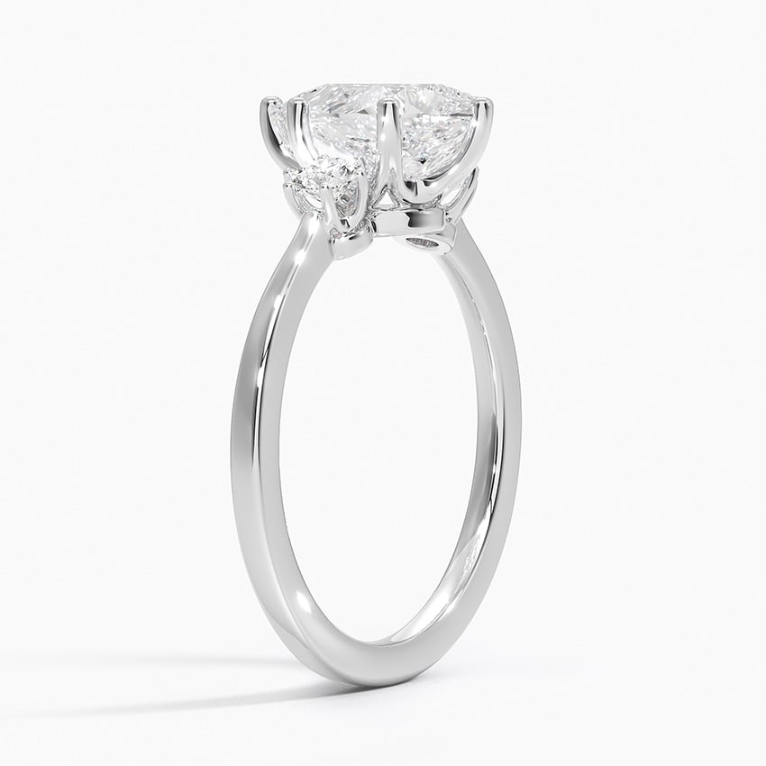 Two shining diamonds rest at either side of the center stone in this classic, sophisticated six prong setting.