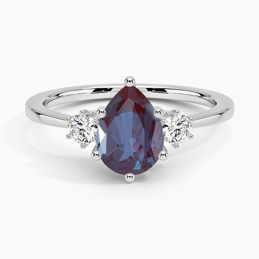 Platinum Tallula Three Stone Lab Diamond Ring with 9x6mm Color Change Pear Lab Grown Alexandrite