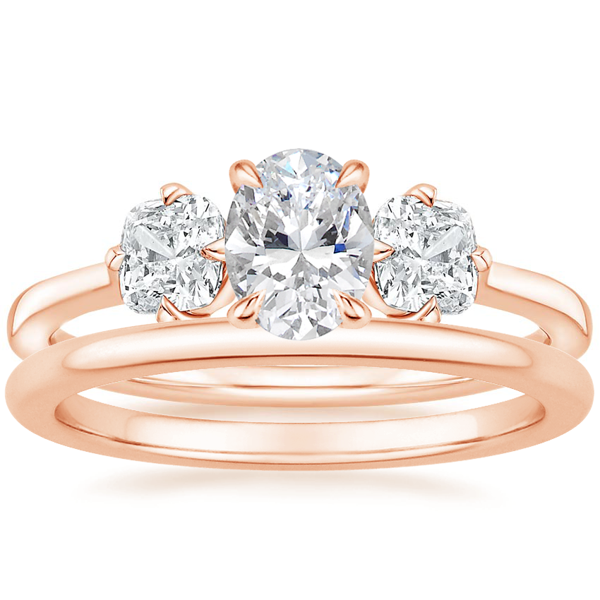 14K Rose Gold Three Stone Cushion Diamond Ring with Petite Comfort Fit Wedding Ring