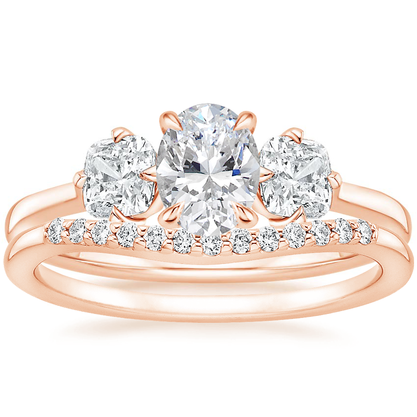14K Rose Gold Three Stone Cushion Diamond Ring with Petite Curved Diamond Ring (1/10 ct. tw.)
