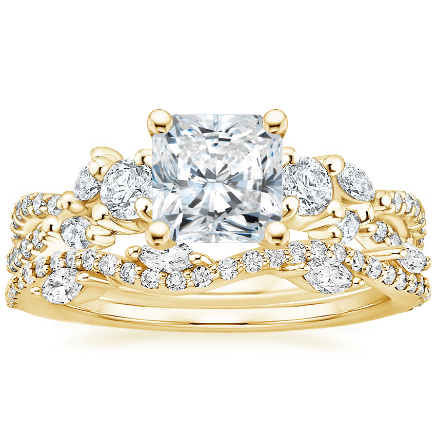 18K Yellow Gold Three Stone Luxe Willow Lab Diamond Ring with Luxe Winding Willow Diamond Ring with 3.71 Carat Radiant Lab Grown Diamond