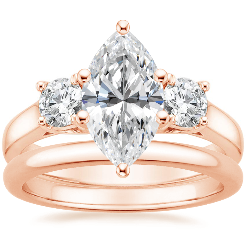 14K Rose Gold Three Stone Trellis Diamond Ring with 2mm Comfort Fit Wedding Ring