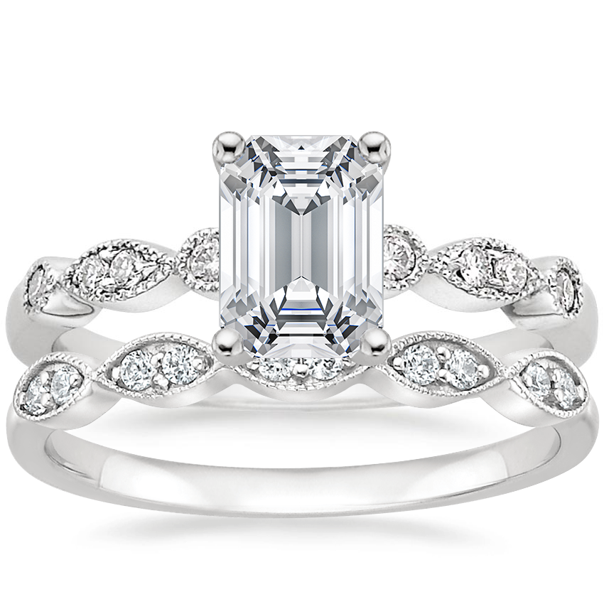 Got this ring in rose gold with a 1-carat emerald-cut diamond, and it looks fantastic. The band is very delicate and petite, which highlights the stone and looks great on my small hand, and I like that the diamond is set low into the band (non-matching wedding bands won't be able to sit exactly flush, if that matters to you). The detailing is beautiful, with a vintage vibe, and it's a little more sparkly than I anticipated in certain light. The ring arrived exactly when it was supposed to, and packaged really nicely. A great option for a unique, low-profile ring.