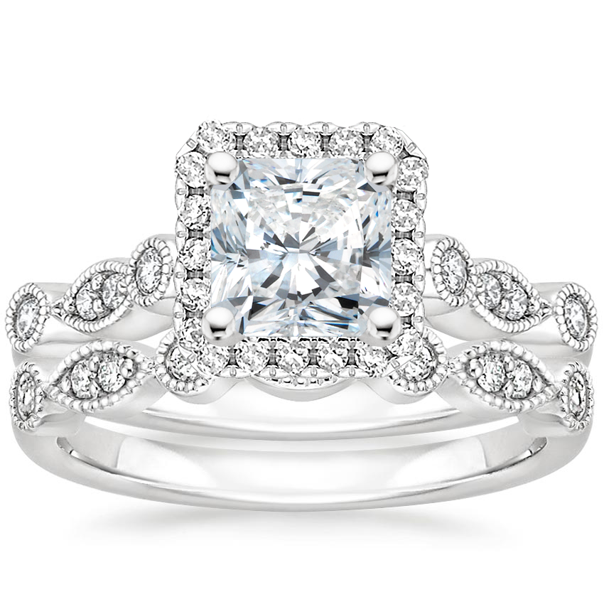 This beautiful pairing achieves a romantic, antique look with alternating round and marquise-shaped settings and milgrain detail. ... Read More