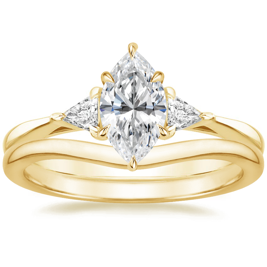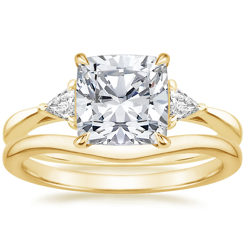 18K Yellow Gold Trillion Three Stone Diamond Ring with Petite Curved Wedding Ring