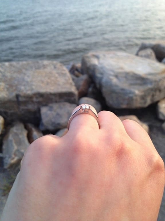 My fiance proposed to me in January 2012 at his apartment where he excitedly jumped on the bed and while proposing he slipped a beautiful True North ring in platinum on my hand before I could finish saying "yes". Even in the dim light I could see how the ring sparkled and how comfortable it felt on my hand as I don't usually wear jewelry. I pleasantly surprised when he turned on the light and was able to get a better look at how exquisitely beautiful the ring was! It was truly a sparkling evening and I said yes. My hands are smaller with long fingers so when ring shopping it was important that the ring not make my hands look overdone while aligning with our ethical beliefs. The True North ring meets those requirements and then some. The setting is simple, delicate, and beautiful while being a unique in the compass placement of the prongs. I've received lots of compliments over the past two years on how bright it sparkles and how beautiful my ring is. This ring has been on my hand since he proposed and can say it is very comfortable. I love the low profile which helps it delicate appearance and keeps it from getting stuck in my jeans pocket when digging out change for example. I have included a picture below taken the morning after he proposed. Here are the specifics on my ring in case it can help you in your ring searches. Round Brilliant cut, .51 carat, G color, SI1 clarity, Excellent cut. Thank you Brilliant Earth for creating my beautiful and ethical ring! I love it! ...Read More