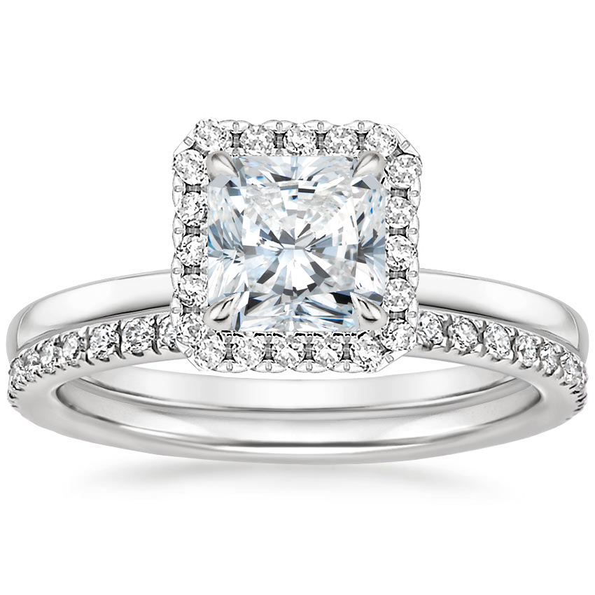 This beautiful bridal set features scalloped pavé diamonds that rise up the gallery and encircle the center gem in a halo of luminous sparkle. The petite diamond wedding ring shimmers with scalloped pavé diamonds that extend three-fourths of the way around the band. ... Read More