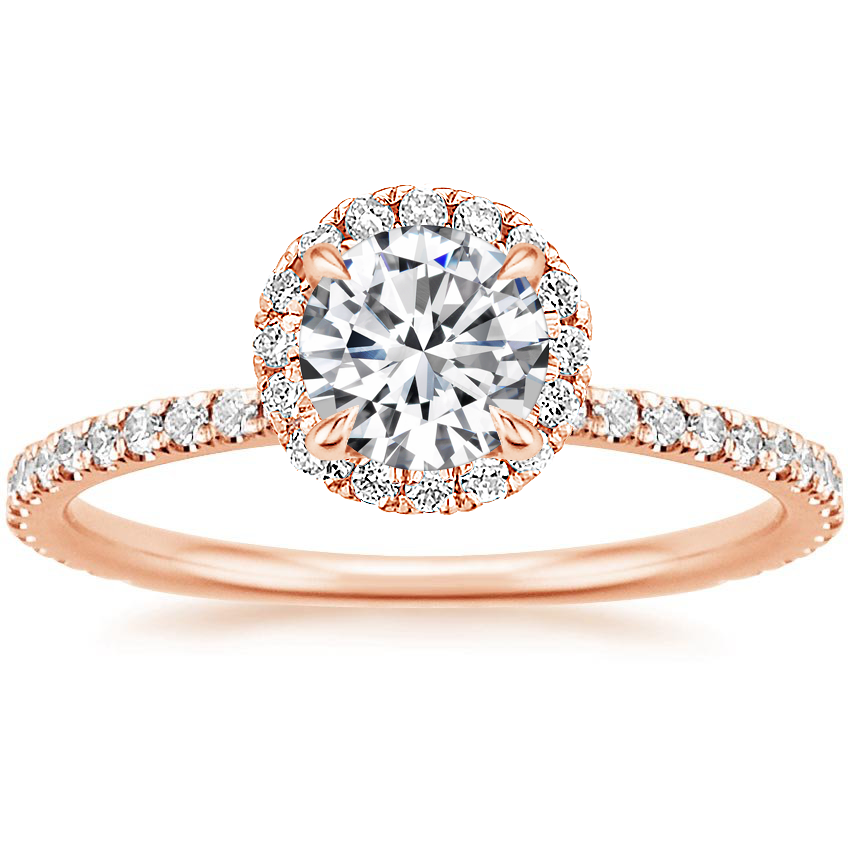 This sparkling halo setting showcases a stunning diamond-encrusted gallery for an elegant look. The delicate wedding band beautifully complements the engagement ring with micro-pavé diamond accents that extend almost entirely around the finger, leaving a small sizing bar in back. ... Read More