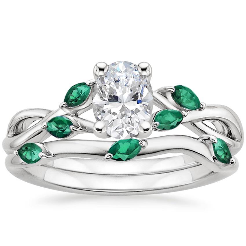 18K White Gold Willow Bridal Set With Lab Emerald Accents