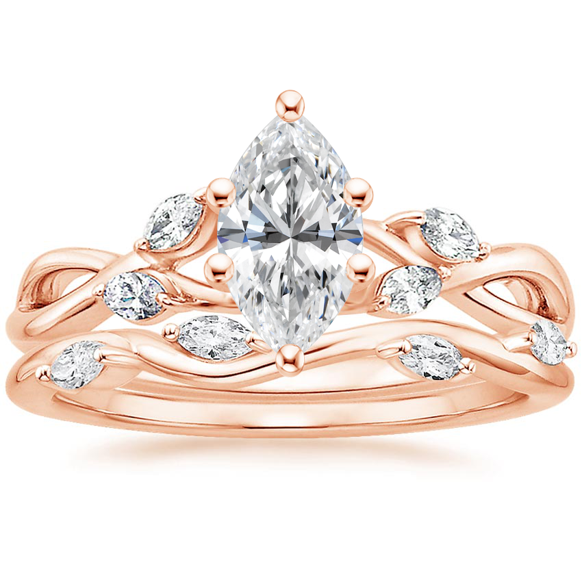 Wispy vines of precious metal entwine towards lustrous marquise diamond buds in this nature-inspired bridal set.