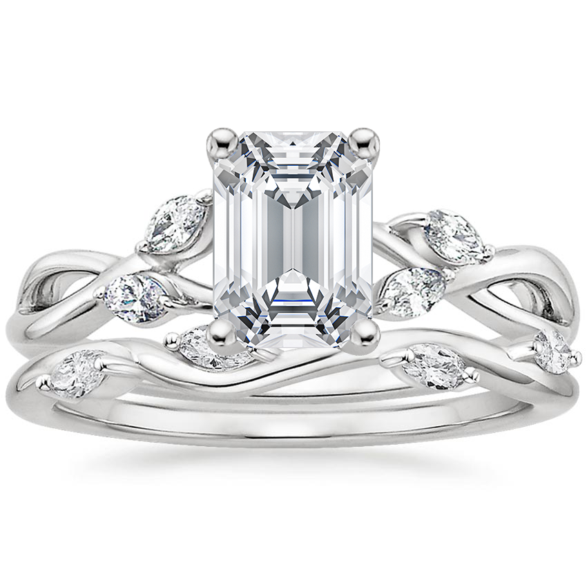Wispy vines of precious metal entwine towards lustrous marquise diamond buds in this nature-inspired bridal set.