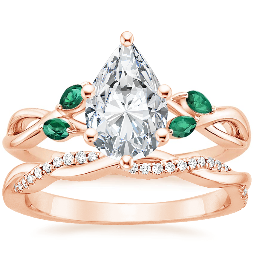 14K Rose Gold Willow Ring With Lab Emerald Accents with Petite Twisted Vine Diamond Ring (1/8 ct. tw.)