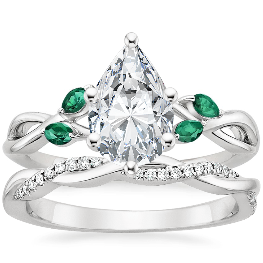 18K White Gold Willow Ring With Lab Emerald Accents with Petite Twisted Vine Diamond Ring (1/8 ct. tw.)