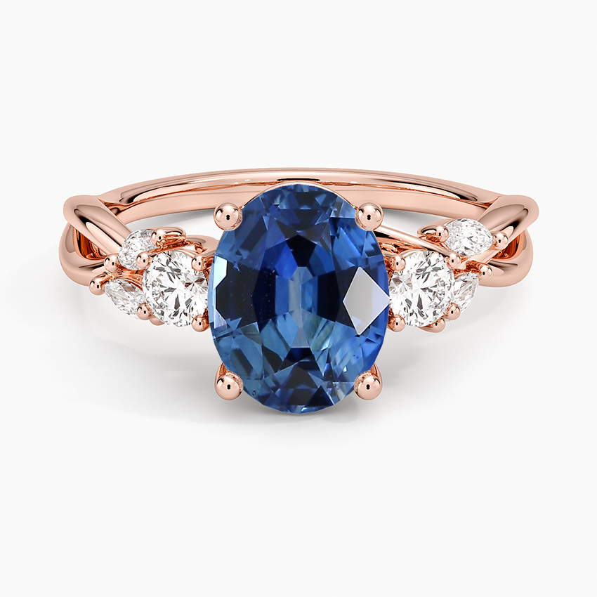14K Rose Gold Willow Three Stone Diamond Ring (1/3 ct. tw.) with 9.3x7.6mm Blue Oval Sapphire