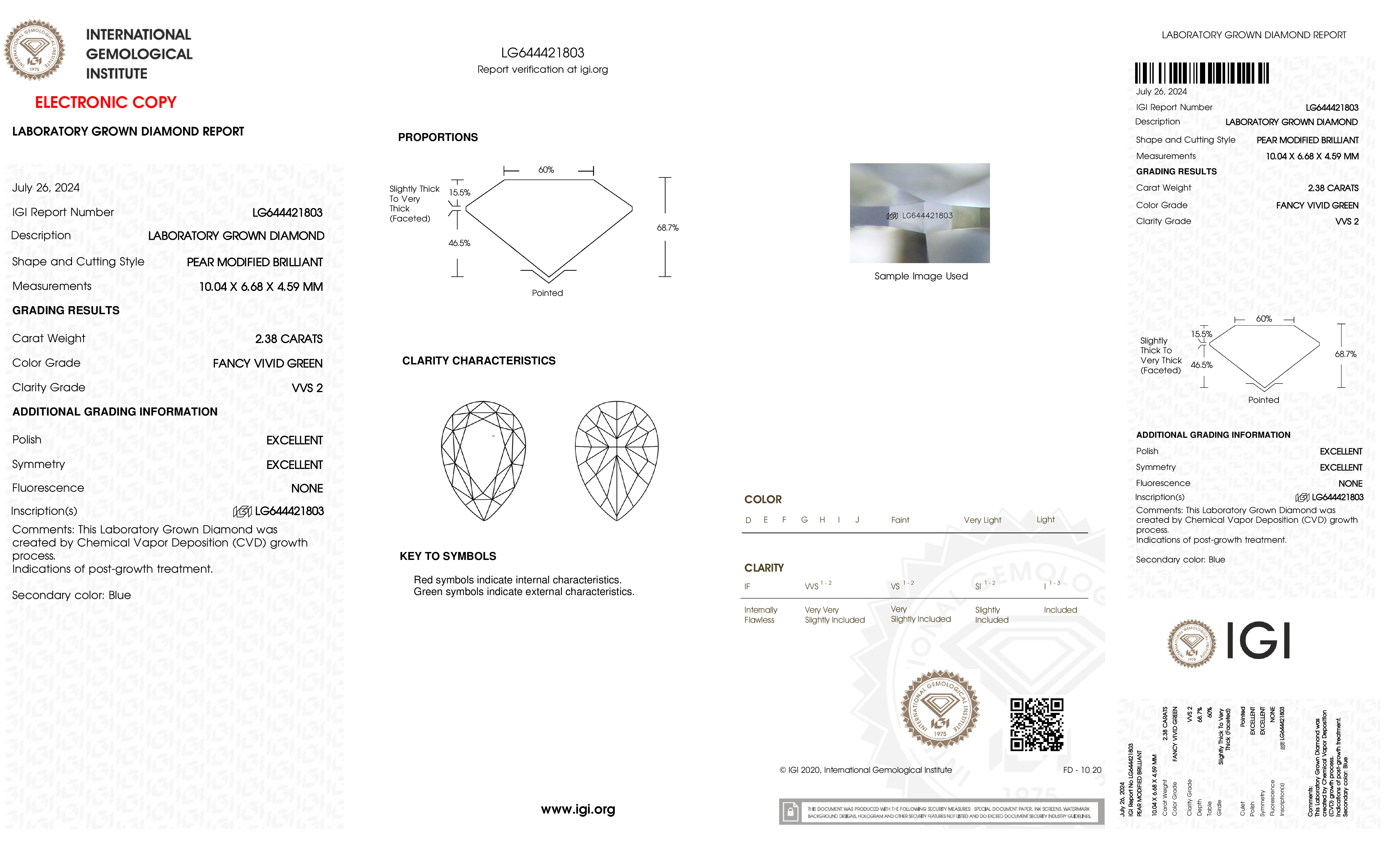 This Certified 2.38 Carat 10.04 x 6.68 x 4.59 mm Green Pear Lab Grown Diamond has been hand selected by our GIA-certified gemologists for its exceptional characteristics and rarity.