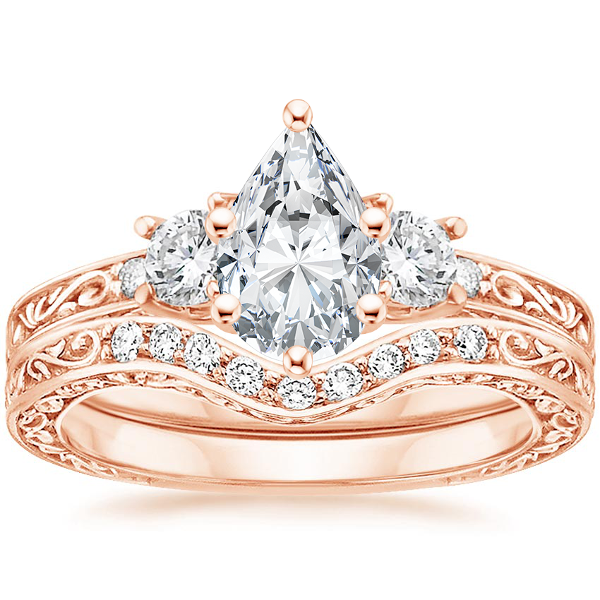 14K Rose Gold Antique Scroll Three Stone Trellis Diamond Bridal Set