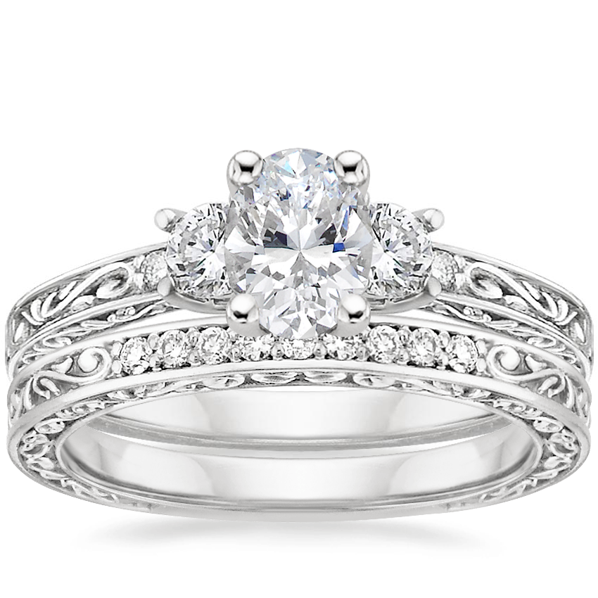 Platinum Antique Scroll Three Stone Trellis Diamond Ring (1/3 ct. tw.) with Delicate Antique Scroll Diamond Ring (1/15 ct. tw.)