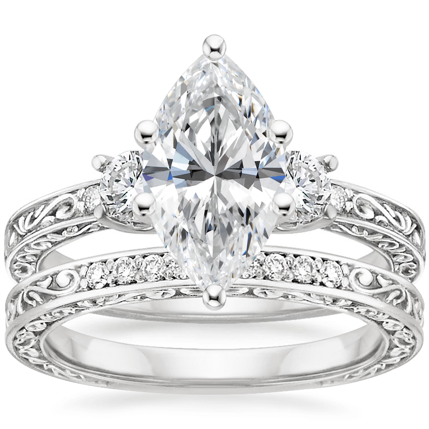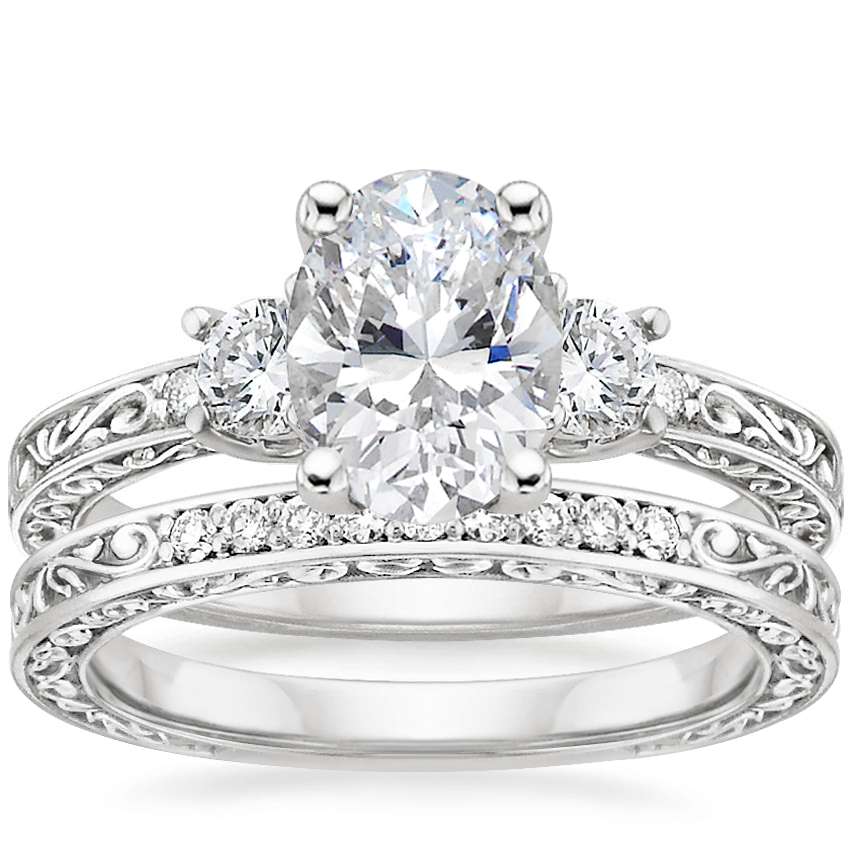 Platinum Antique Scroll Three Stone Trellis Diamond Ring (1/3 ct. tw.) with Delicate Antique Scroll Diamond Ring (1/15 ct. tw.)