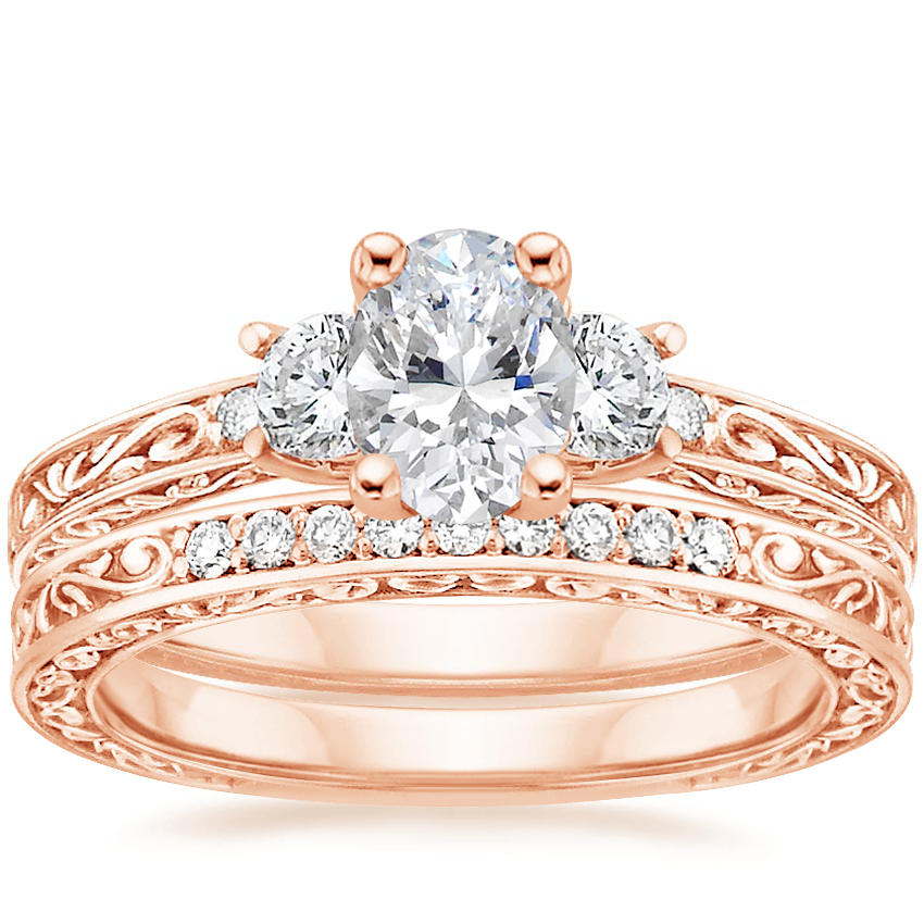 14K Rose Gold Antique Scroll Three Stone Trellis Diamond Ring (1/3 ct. tw.) with Delicate Antique Scroll Diamond Ring (1/15 ct. tw.)