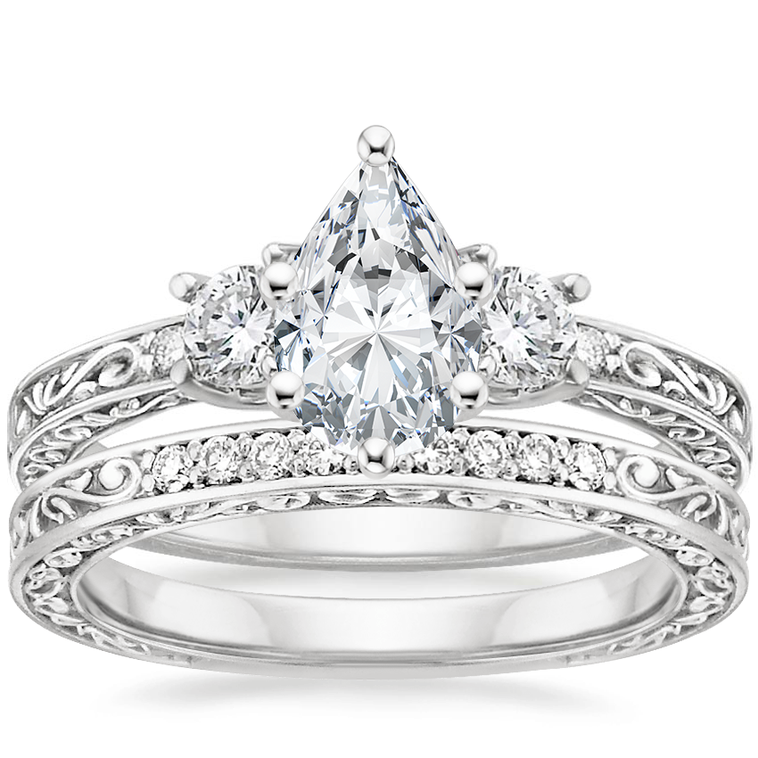 18K White Gold Antique Scroll Three Stone Trellis Diamond Ring (1/3 ct. tw.) with Delicate Antique Scroll Diamond Ring (1/15 ct. tw.)