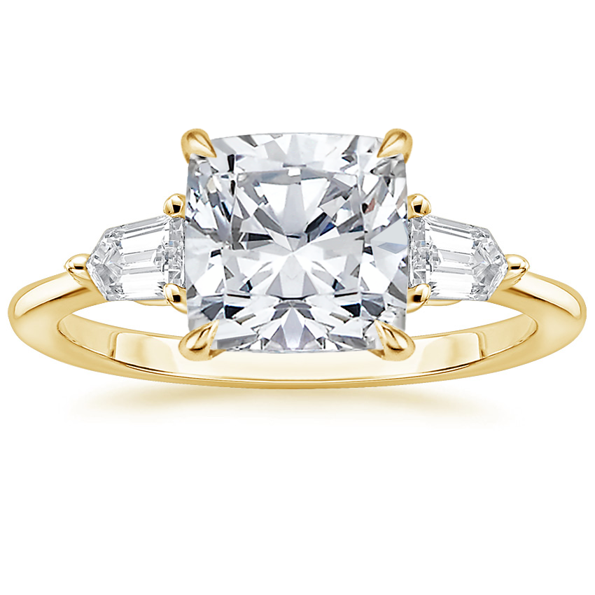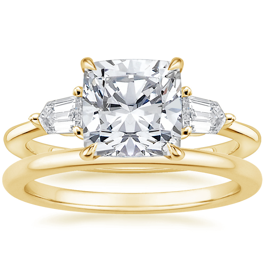 18K Yellow Gold Bullet Shape Three Stone Diamond Ring with Petite Comfort Fit Wedding Ring