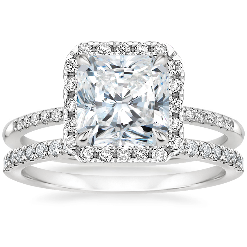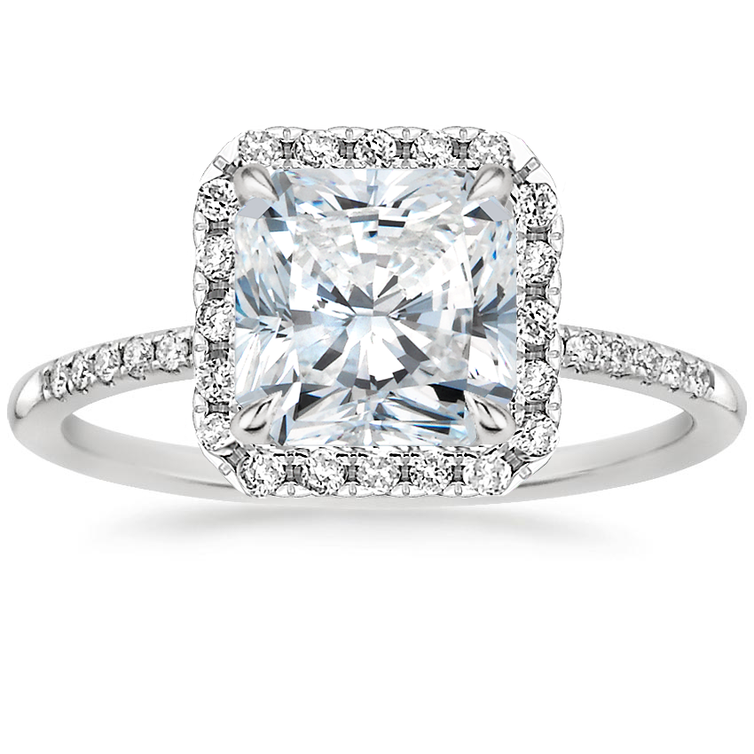 My fiancé gave me this ring a month ago and I love it!! It is the Cambria in 14k rose gold with a 9x7 radiant moissanite as the center stone. We decided to go with moissanite because I love the big rock look and because of how affordable, shiny and durable moissanite is. The band is super thin tiny and delicate which is what I was going for. I don't know the exact price but it was right under 5,000! If you're thinking moissanite get it you won't regret it :)