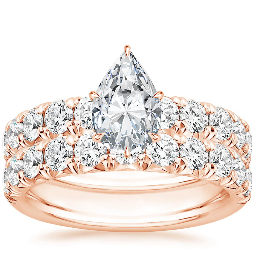 This glamorous bridal set secures the center gem with elegant claw prongs and features French pavé diamonds, a setting style that allows light to reach the diamonds from multiple angles and enhances their sparkle (1 7/8 total carat weight). ... Read More