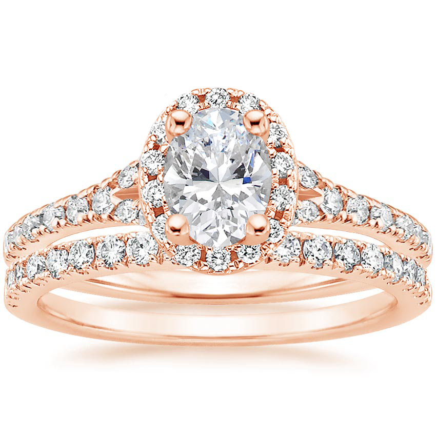 A glittering softened halo of diamonds surrounds the center gem in this matched. A scalloped pav?split-shank paired with a petite diamond band adds a stylish, dazzling effect. ... Read More