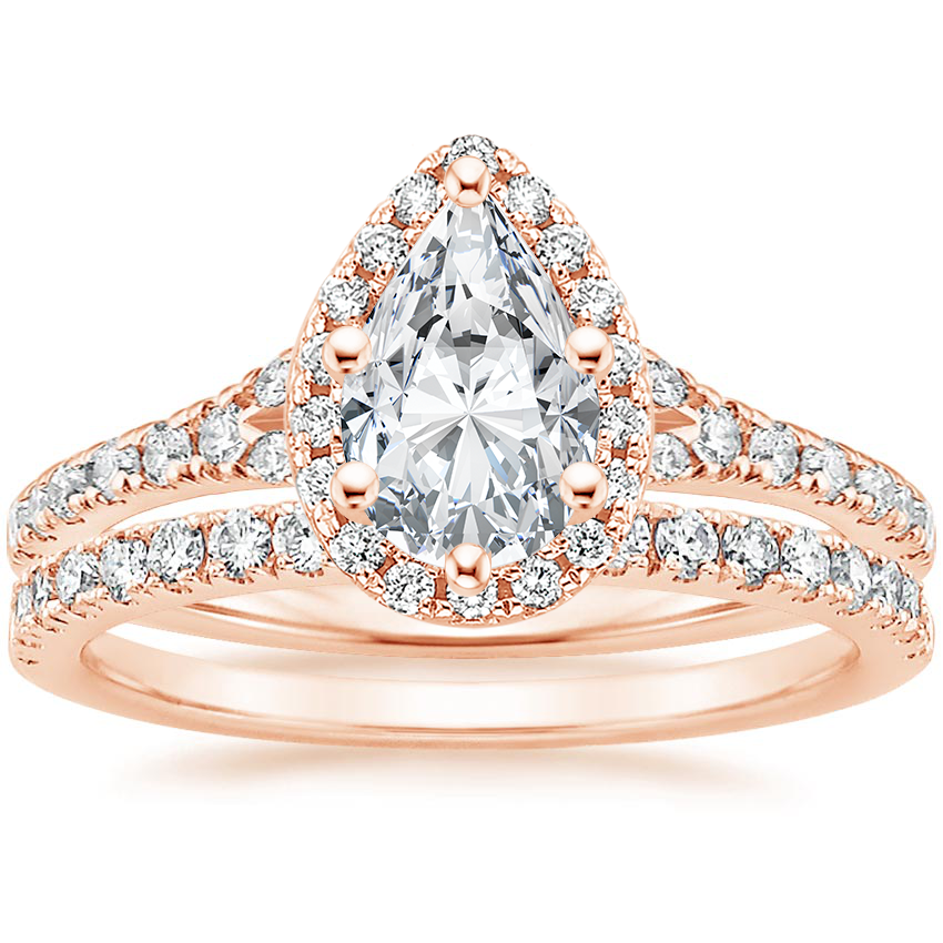 A glittering softened halo of diamonds surrounds the center gem in this matched. A scalloped pav?split-shank paired with a petite diamond band adds a stylish, dazzling effect. ... Read More