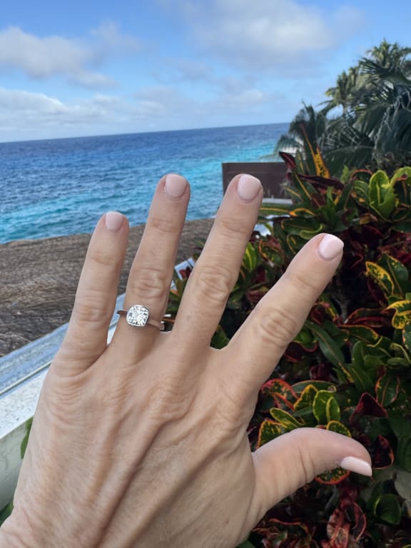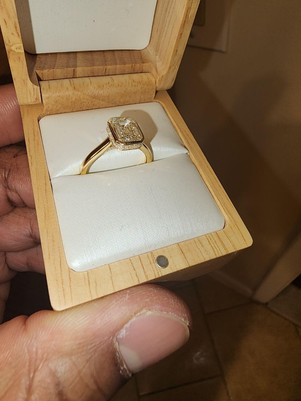 I got this ring to celebrate our 25th anniversary, and it is absolutely stunning. I chose a 2.06 carat lab grown diamond, and it's the perfect size! The diamond is gorgeous and the yellow gold of the halo complements the pear shaped diamond perfectly. I have gotten so many compliments on it, and I just love it! ...Read More