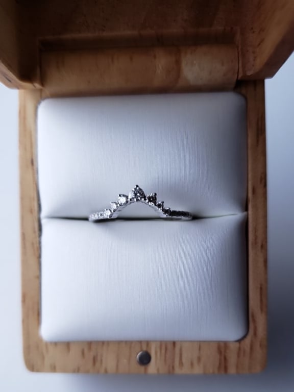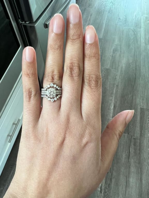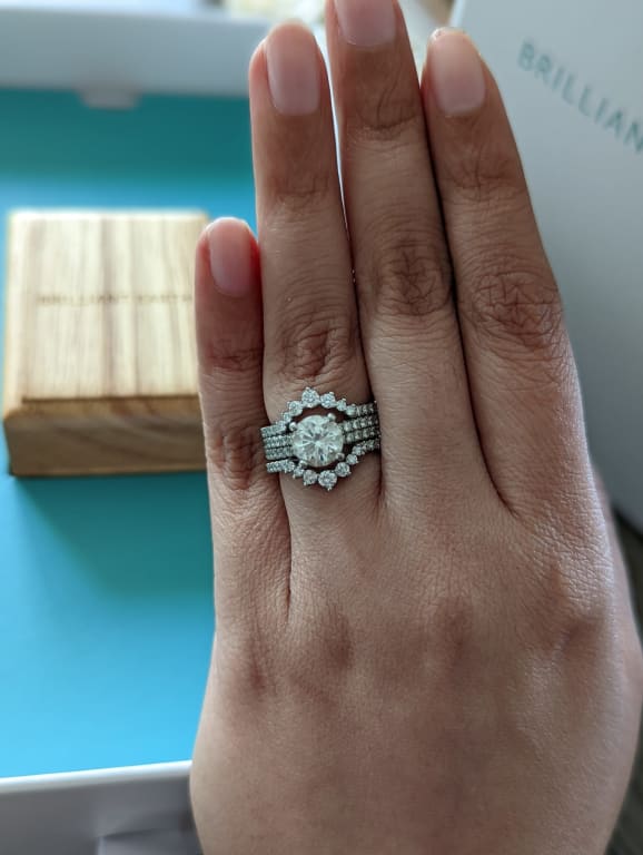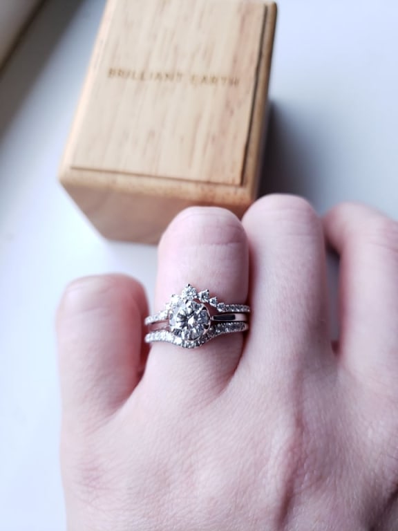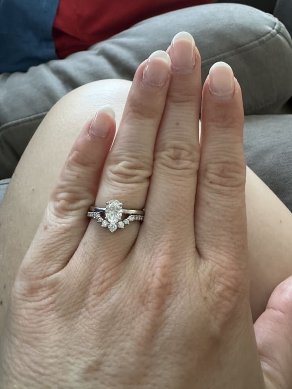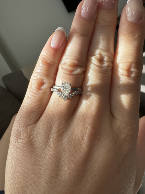 I wanted a unique wedding band that made my petite comfort fit with an oval diamond (also from Brilliant Earth) pop! This ring is even more stunning in person. The band is super delicate but still adds that sparkle. Additionally, the diamonds along the curve gradually increase in size, creating a captivating statement piece. ...Read More