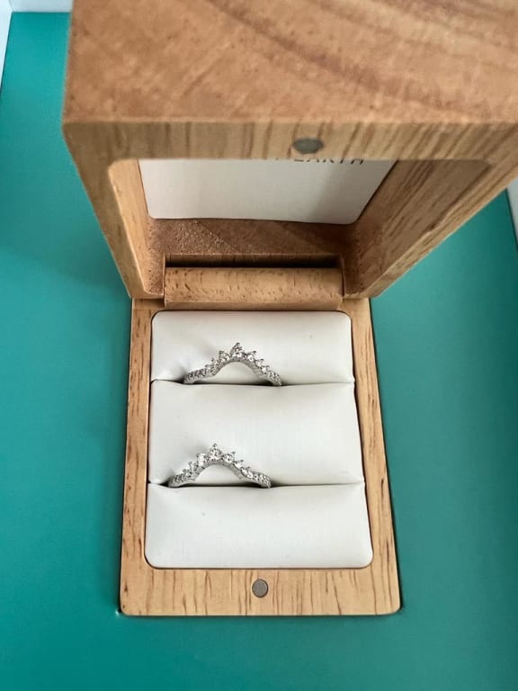 I wanted a unique wedding band that made my petite comfort fit with an oval diamond (also from Brilliant Earth) pop! This ring is even more stunning in person. The band is super delicate but still adds that sparkle. Additionally, the diamonds along the curve gradually increase in size, creating a captivating statement piece.