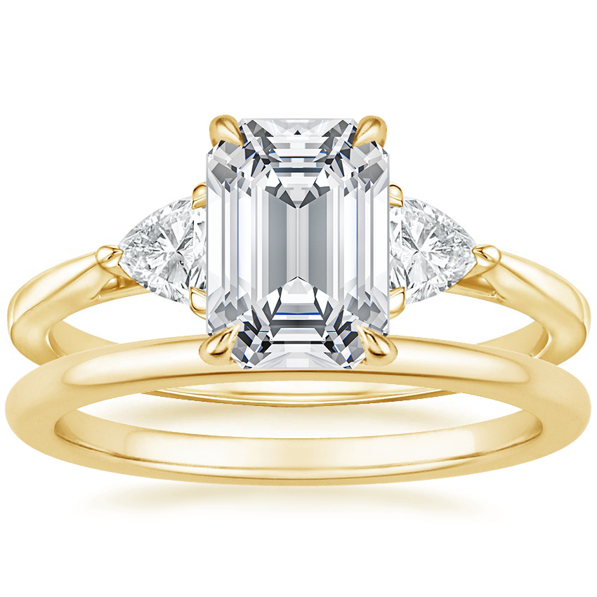 Luxe Trillion Cut Three Stone Diamond Ring with Petite Comfort Fit Wedding Ring in 18K Yellow Gold