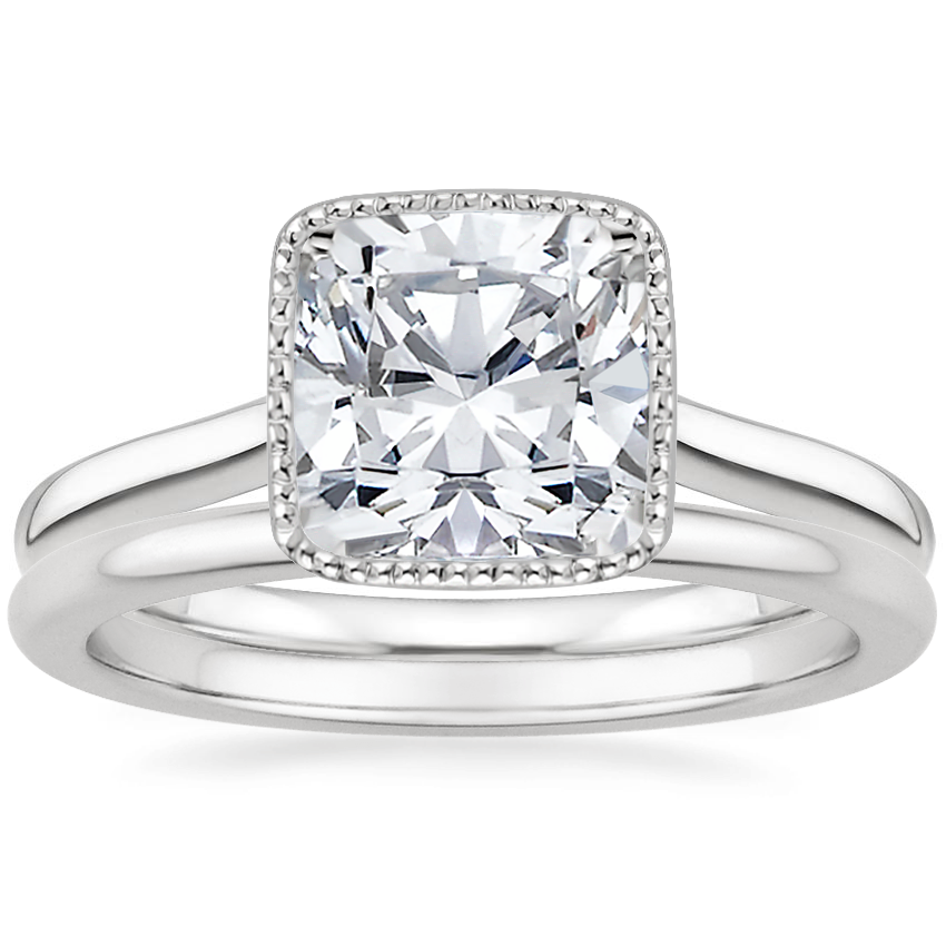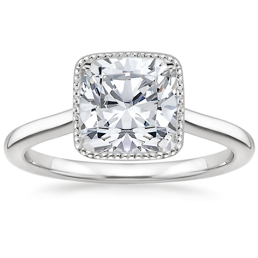 I chose this ring as my engagement ring because it's so special! The milgrain gives the ring such a vintage look. I love the clean look of the band. I had it customized to 14k yellow gold because I prefer the color a bit more. My ring is set with an 8mm round moissanite.