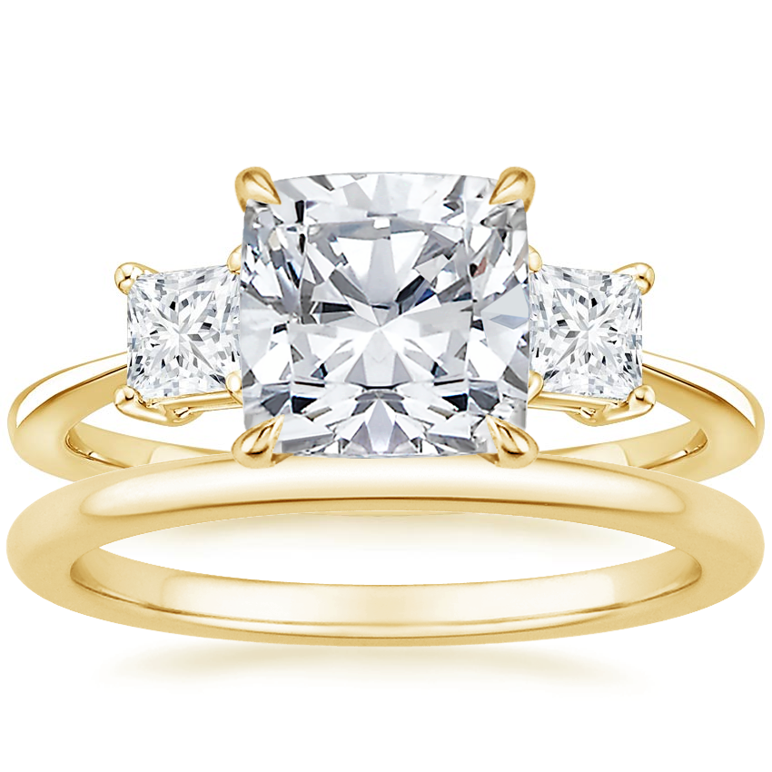 18K Yellow Gold Princess Cut Three Stone Diamond Ring with Petite Comfort Fit Wedding Ring