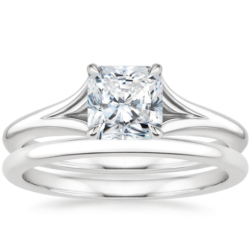 At once feminine and contemporary, the engagement ring divides into graceful ribbons of precious metal that intertwine and embrace the center gemstone, securing it with claw prongs. The petite wedding band features a rounded inside edge for increased comfort. ... Read More
