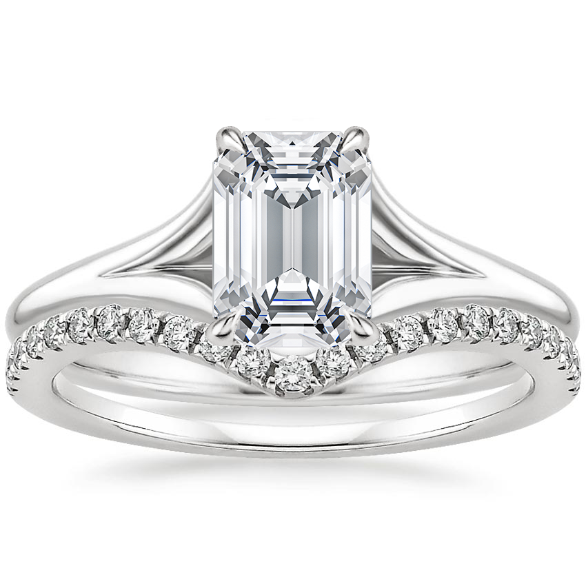 This stunning bridal set divides into graceful ribbons of precious metal that intertwine and embrace the center gemstone. An artistic flair of glittering scalloped pavé diamonds sits flush against the engagement ring, enhancing this bridal set's contemporary look. ... Read More
