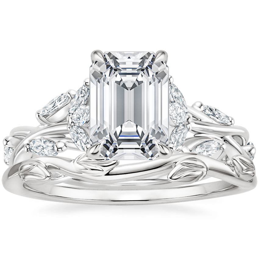 Setting: Secret Garden material: platinum Primary Gemstone: moissanite, marquis cut accent gemstones: 16x lab diamonds I proposed to my fiance with this ring and she loves it! I chose platinum since she has some sensitivity to metals and platinum is the least likely to cause a reaction. The vine design goes around the entire top and sides of the ring, which we like because it carries the theme of the design over most of the body of the ring instead of just around the the main gemstone. Liz is a huge fan of Lord of The Rings, so I figured she would love a design theme that could pass as one of the elven rings of power - the marquis cut with the viney designs certainly achieves that. As a piano player, she has fairly long fingers compared to how wide her hand is, so I figured the Marquis cut would complement her hand shape - she (thankfully for me) agrees! I very much enjoyed the ability to choose the setting, material, and gemstone. As an engineer and maker, it was important to me that I have some role in the design of the ring to make sure that the ring was *perfect* for MY fiance. The tools provided by Brilliant Earth provided enough options that I was happy with the process. Liz said before I proposed (not so subtly) that she doesn't like natural diamonds because they are expensive and some of the history involving the trade. Moissanite is a fantastic material for gemstones. It is sparkly (which she adores like a seagull), affordable, lab made, and was originally discovered in meteorites! There is NO need to have to buy a natural diamond when Brilliant Earth has these beautiful moissanite gemstones! Highly recommended. The accent diamonds are lab diamonds, and add to the detail of the ring. It is not a simple ring, and there is a lot of detail for the wearer to appreciate. A word from Liz: "I love all the small details, and how the moissanite sparkles in the ligh