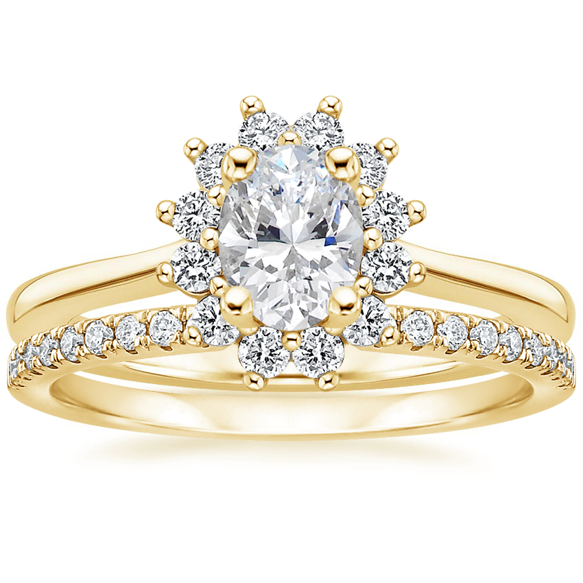 My husband proposed to me with the oval sunburst halo ring and we chose a gold wedding band together at the Brilliant Earth in Chicago. I am in love with it even a year later! I get so many compliments!