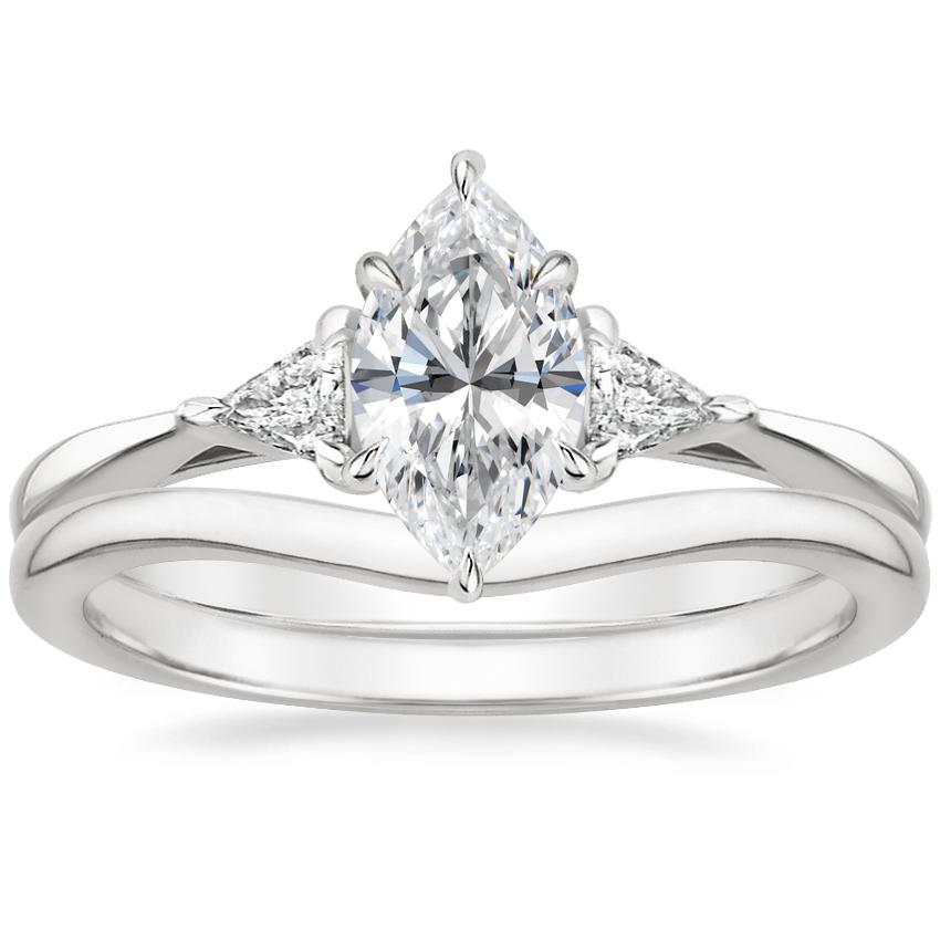 18K White Gold Trillion Three Stone Diamond Ring with Petite Curved Wedding Ring