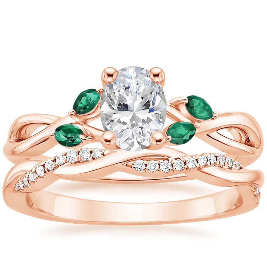 14K Rose Gold Willow Ring With Lab Emerald Accents with Petite Twisted Vine Diamond Ring (1/8 ct. tw.)
