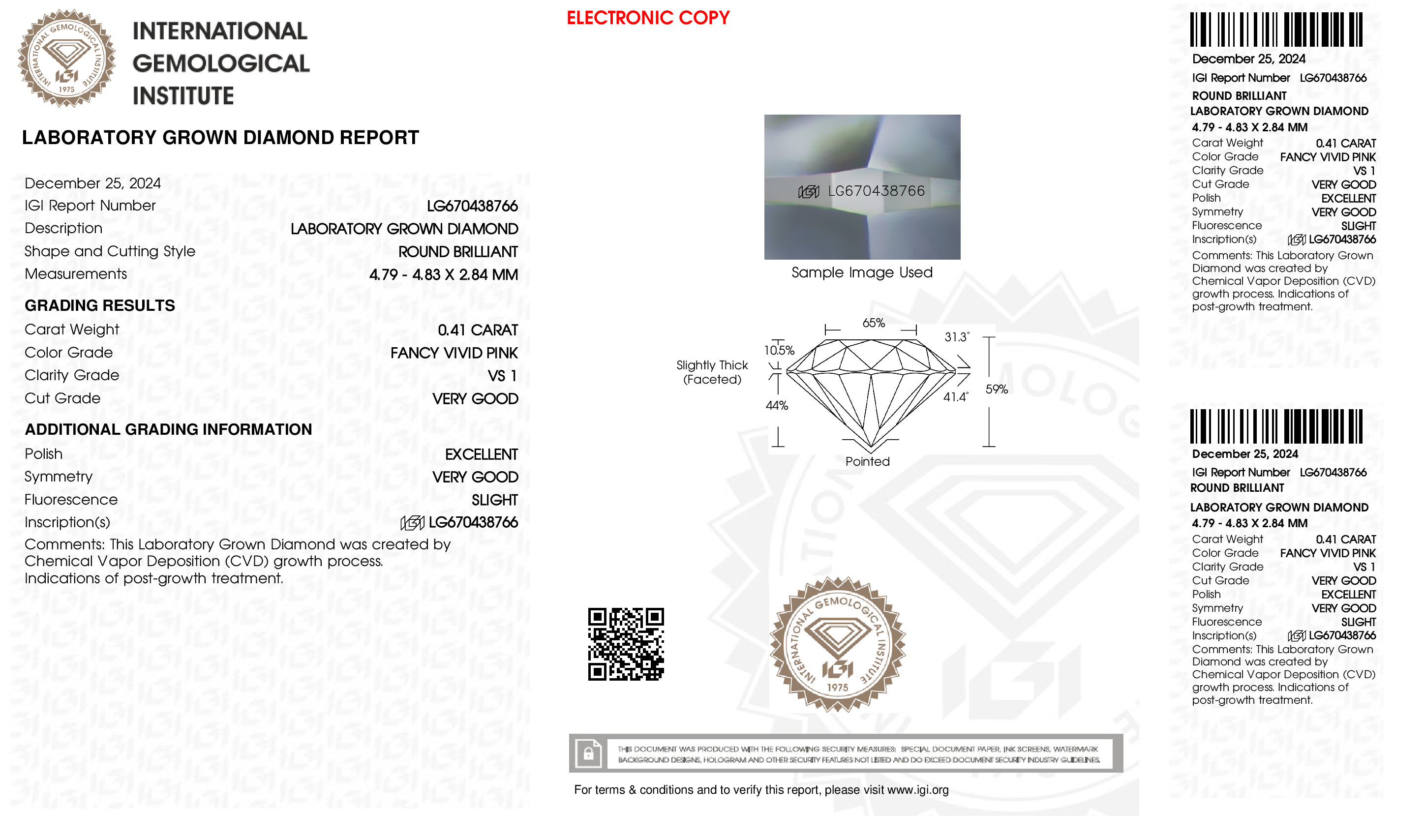 This Certified 0.41 Carat 4.83 x 4.79 x 2.84 mm Pink Round Lab Grown Diamond has been hand selected by our GIA-certified gemologists for its exceptional characteristics and rarity.