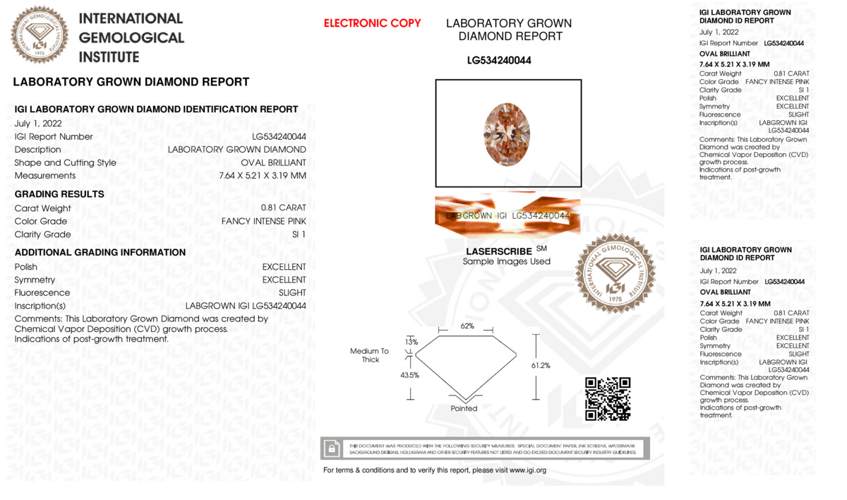 This Certified 0.81 Carat 7.64 x 5.21 x 3.19 mm Pink Oval Lab Grown Diamond has been hand selected by our GIA-certified gemologists for its exceptional characteristics and rarity.