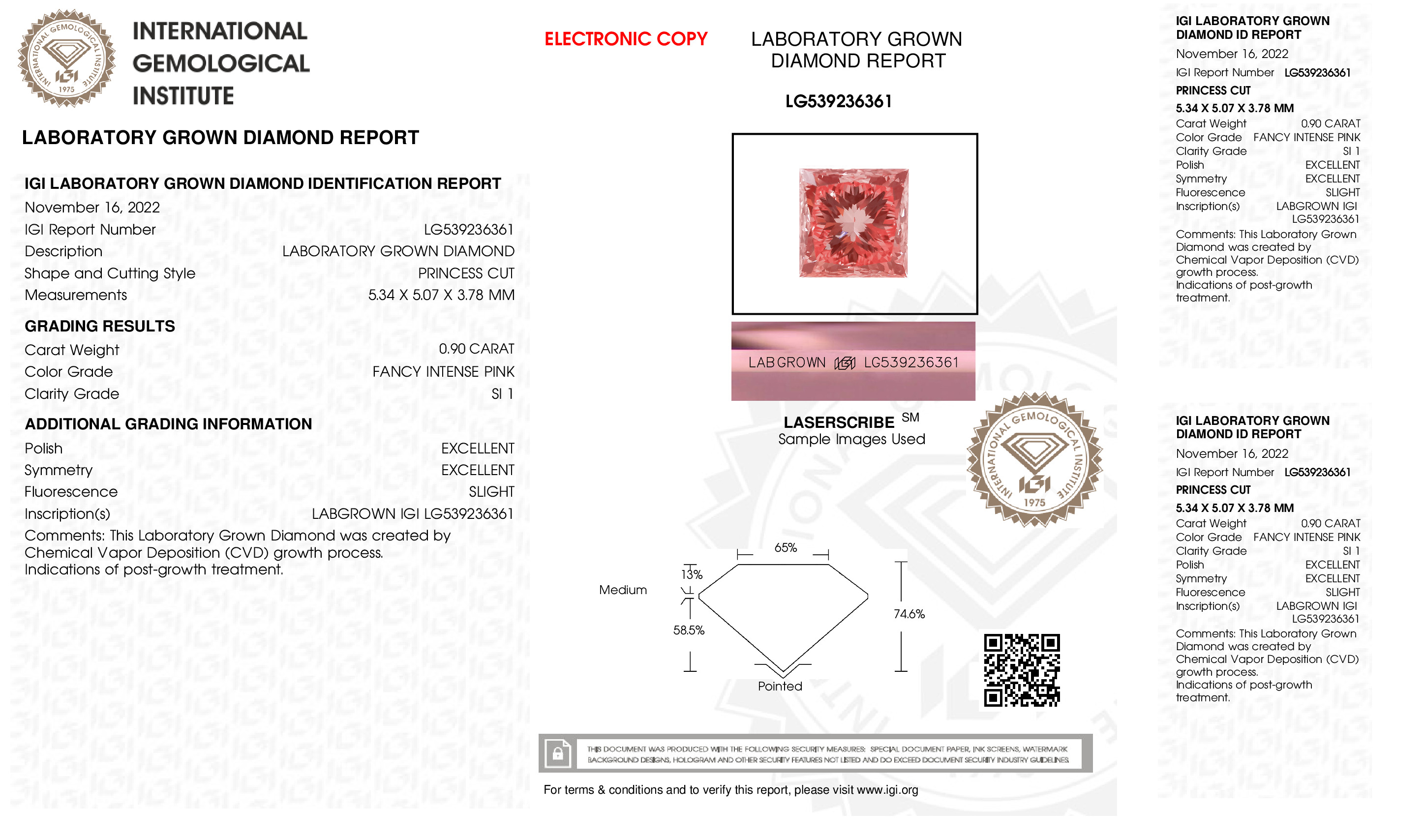 This Certified 0.9 Carat 5.34 x 5.07 x 3.78 mm Pink Princess Lab Grown Diamond has been hand selected by our GIA-certified gemologists for its exceptional characteristics and rarity.