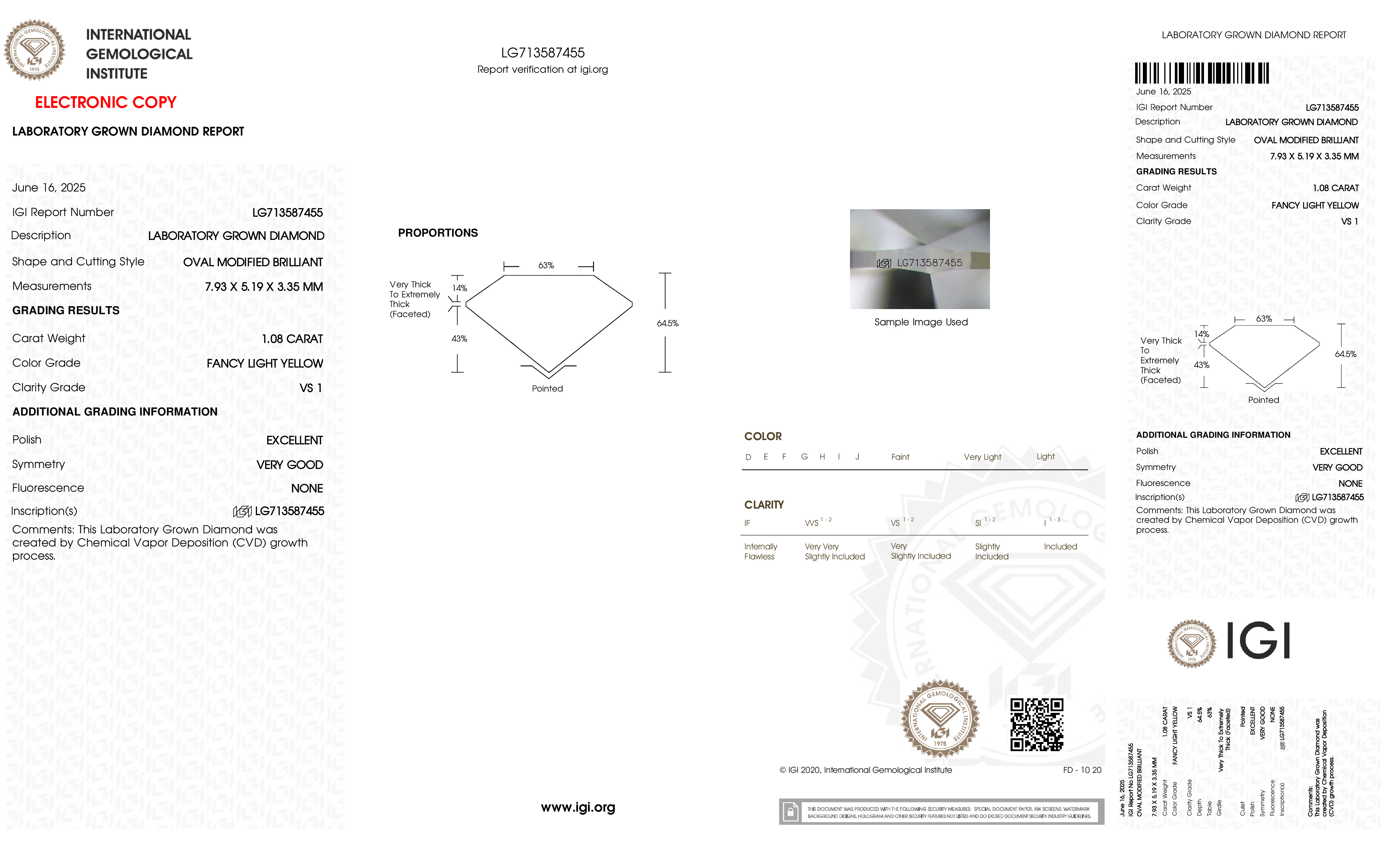 This Certified 1.08 Carat 7.93 x 5.19 x 3.35 mm Yellow Oval Lab Grown Diamond has been hand selected by our GIA-certified gemologists for its exceptional characteristics and rarity.