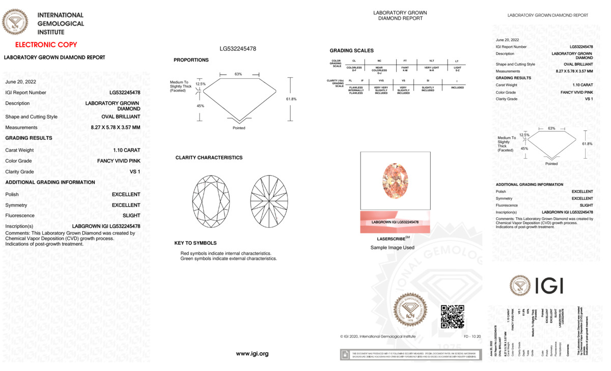 This Certified 1.1 Carat 8.27 x 5.78 x 3.57 mm Pink Oval Lab Grown Diamond has been hand selected by our GIA-certified gemologists for its exceptional characteristics and rarity.