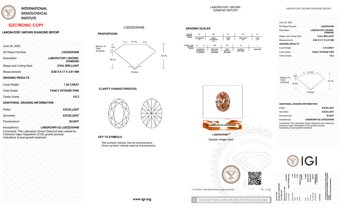 This Certified 1.34 Carat 8.69 x 6.17 x 3.91 mm Pink Oval Lab Grown Diamond has been hand selected by our GIA-certified gemologists for its exceptional characteristics and rarity.