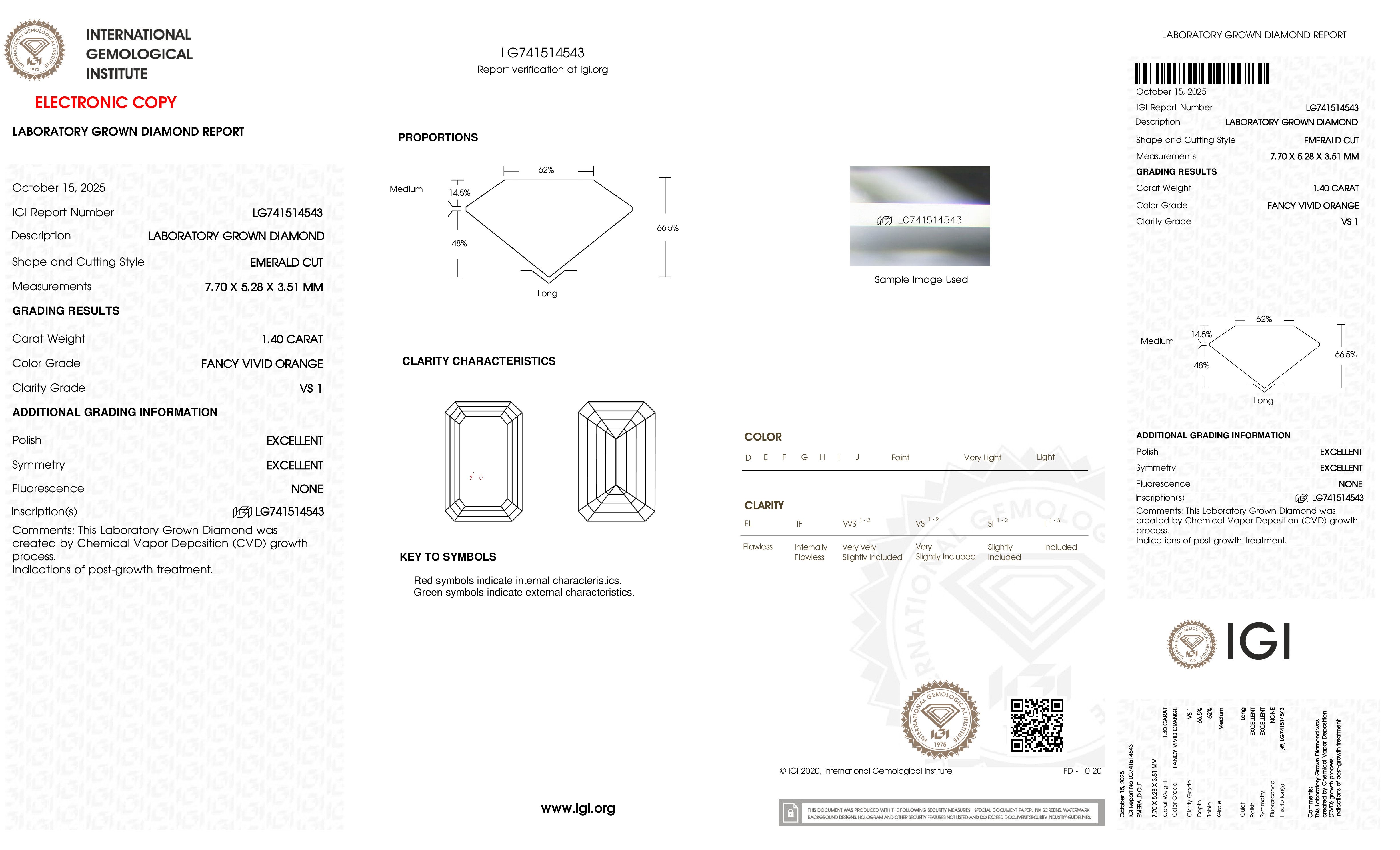This Certified 1.40 Carat 7.70 x 5.28 x 3.51 mm Orange Emerald Lab Grown Diamond has been hand selected by our GIA-certified gemologists for its exceptional characteristics and rarity.