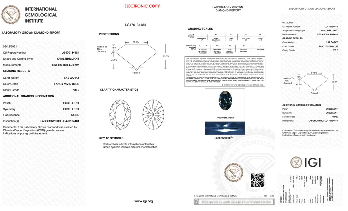 This Certified 1.42 Carat 8.55 x 6.38 x 4.04 mm Blue Oval Lab Grown Diamond has been hand selected by our GIA-certified gemologists for its exceptional characteristics and rarity.
